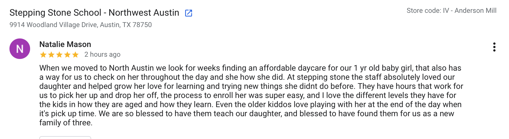 Welcome to the Stepping Stone School Lakeline located at 12301 Hymeadow Drive in Northwest Austin conveniently located off the southbound frontage road of 183 with easy access to and from Lakeline Boulevard, Anderson Mill Road and HWY 620. Many major employers such as Charles Schwabb, Seton Hospital Northwest, Apple Computer, Flextronics, Texas Association of School Boards and Lakeline Mall are close by. The campus has an abundance of Heritage oak trees framing the front of the school and providing shade for all four age-appropriate playgrounds securely tucked behind the school.