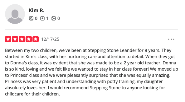 Welcome to the Stepping Stone School Lakeline located at 12301 Hymeadow Drive in Northwest Austin conveniently located off the southbound frontage road of 183 with easy access to and from Lakeline Boulevard, Anderson Mill Road and HWY 620. Many major employers such as Charles Schwabb, Seton Hospital Northwest, Apple Computer, Flextronics, Texas Association of School Boards and Lakeline Mall are close by. The campus has an abundance of Heritage oak trees framing the front of the school and providing shade for all four age-appropriate playgrounds securely tucked behind the school.