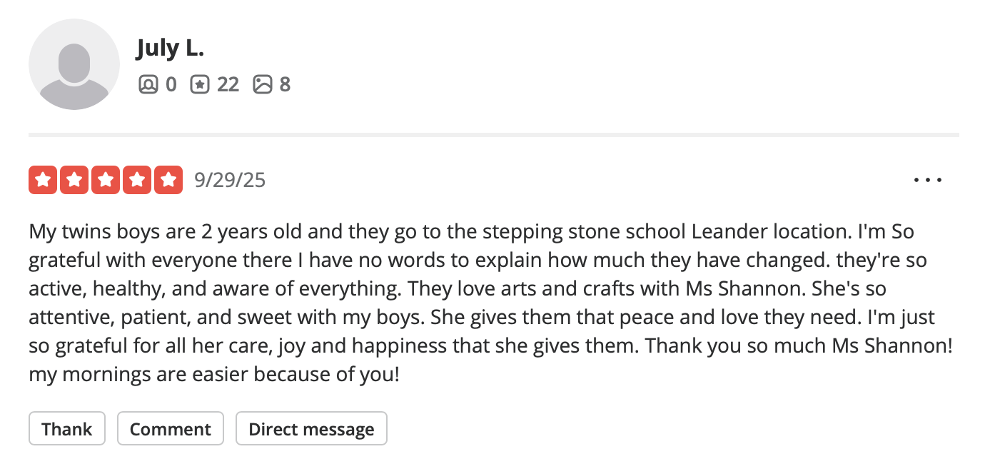 Welcome to the Stepping Stone School located at 225 Blockhouse Drive in Leander near Crystal Falls and northwest Round Rock. It is conveniently located off of Highway 183 and Toll Road 183A and graces the entry to the Blockhouse Creek subdivision. The Block House and Crystal Falls neighborhoods are growing and attracting many families with young children. The school was designed and built from the ground up by the Paver Family ensuring security and boasts a large indoor atrium with hallways radiating out east and west with a separate school age wing. Recently, a major interior and exterior renovation has been completed.